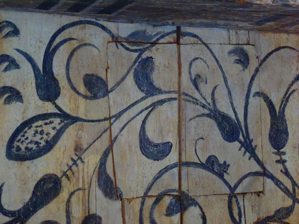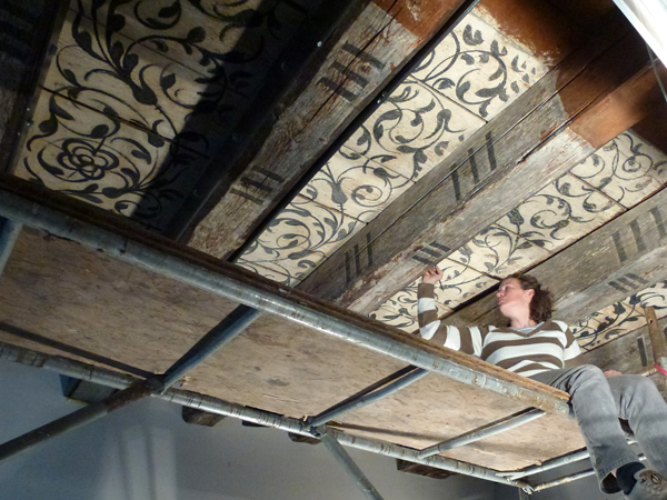 Polychrom gefasste Holzbalkendecke mit Bemalung aus dem 17. Jahrhundert. Restaurierung und Konservierung in Arbeitsgemeinschaft mit Thomas Sensburg, Restaurator in Kaufbeuren.